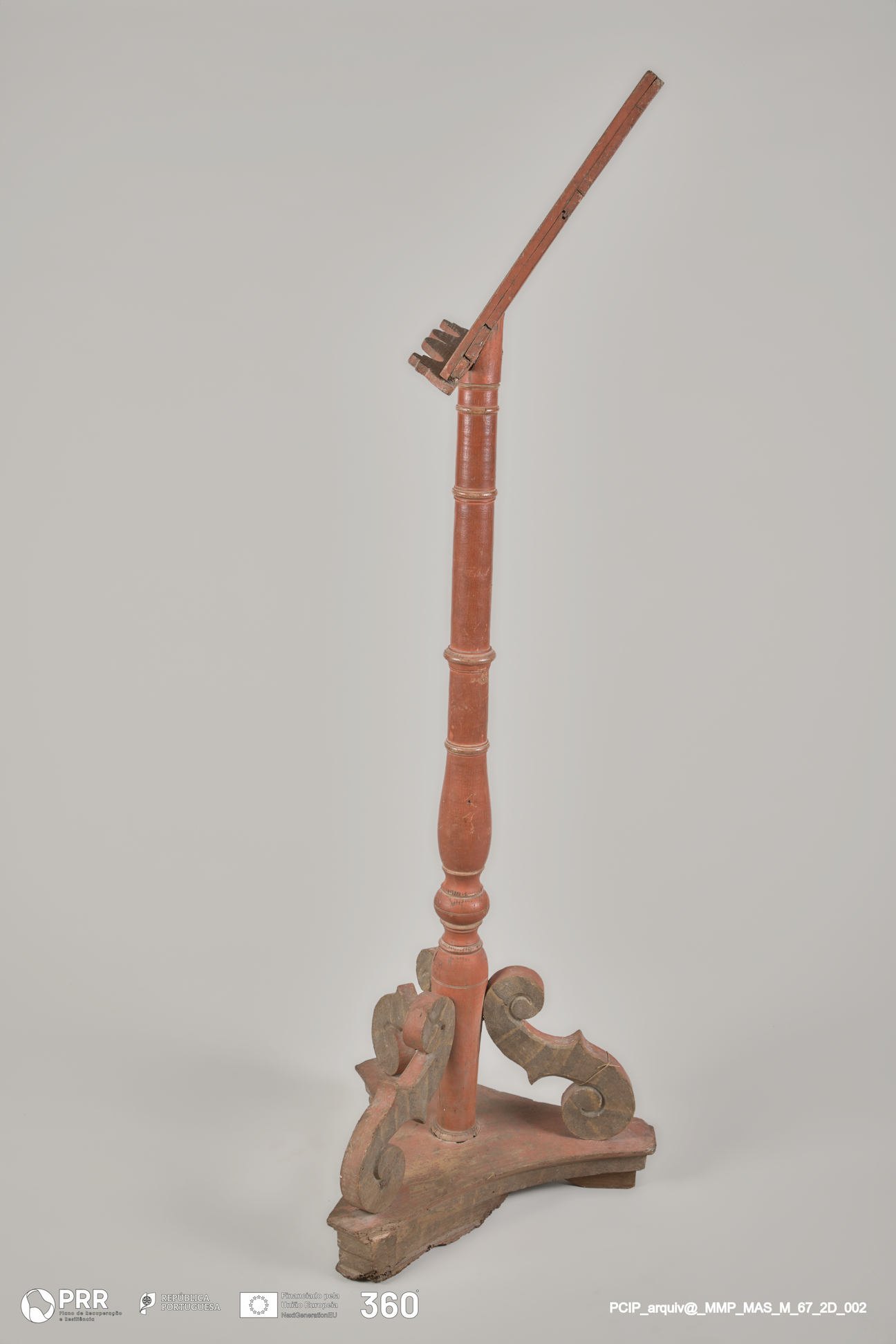 Matéria/Técnica: Madeira torneada e policromada; Cronologia: Século XVIII; Autoria: Desconhecida; Dimensões (cm): Altura: 154; Comprimento: 52; bissetriz - 45.