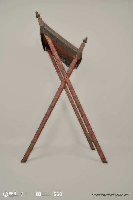 Matéria/Técnica: Seda lavrada com fundo em damasco lavrado a fio metálico, galão tecido a fio metálico; metal fundido, inciso e dourado.; Cronologia: Século XVIII; Autoria: Desconhecida; Dimensões (cm): Altura: 159; Largura: 91; Comprimento: 55.