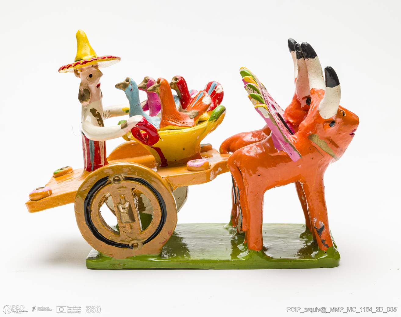 Matéria/Técnica: Barro branco modelado. Pintura a frio nas cores vermelho, preto, amarelo, azul claro, castanho e verde; Cronologia: 1984; Autoria: Ana Lopes Gonçalves, Galegos Santa Maria, Barcelos; Dimensões (cm): Altura: 17; Largura: 7,14; Comprimento: 20.
