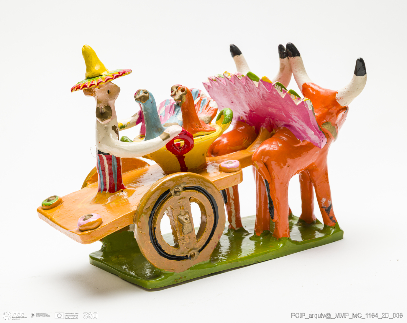 Matéria/Técnica: Barro branco modelado. Pintura a frio nas cores vermelho, preto, amarelo, azul claro, castanho e verde; Cronologia: 1984; Autoria: Ana Lopes Gonçalves, Galegos Santa Maria, Barcelos; Dimensões (cm): Altura: 17; Largura: 7,14; Comprimento: 20.