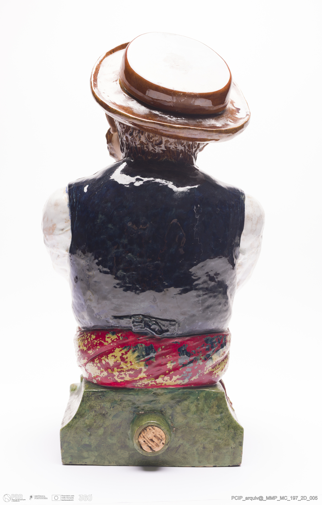 Matéria/Técnica: Barro vermelho modelado e moldado. Vidrado polícromo: verde de cobre, castanho de manganês, preto e branco de estanho. Aplicação de pintura polícroma a frio nos braços, mãos, rosto e cinta; Cronologia: 1903; Autoria: José Francisco de Sousa Filho / Fábrica José Francisco de Sousa Filho, Caldas da Rainha; Dimensões (cm): Altura: 39; Largura: 22; Comprimento: 23.