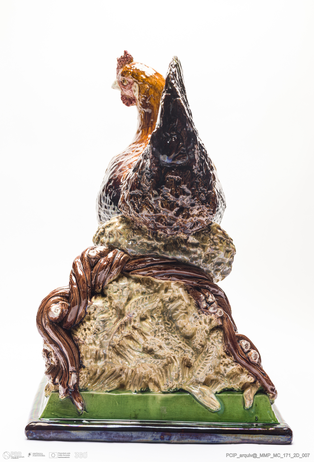 Matéria/Técnica: Barro vermelho moldado. Vidrado polícromo: preto, castanho escuro e mel, vermelho, branco e verde; Cronologia: 1900; Autoria: Rafael Bordalo Pinheiro / Fábrica de Faianças das Caldas da Rainha; Dimensões (cm): Altura: 42; Largura: 30; Comprimento: 28.