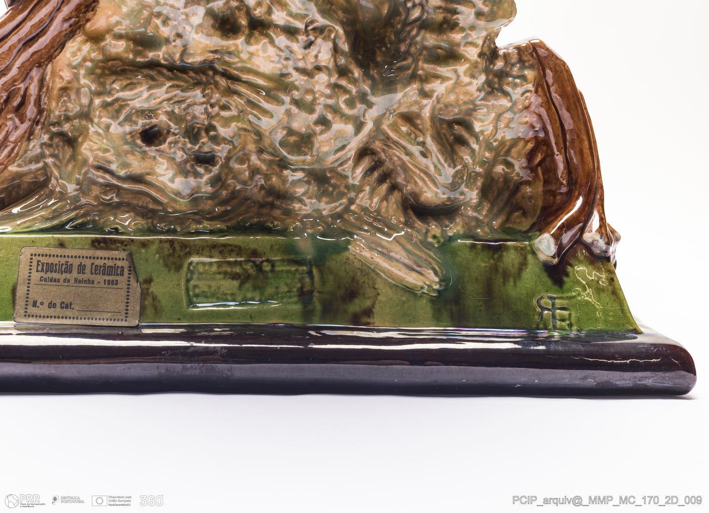 Matéria/Técnica: Barro vermelho moldado. Vidrado polícromo: preto, castanho escuro e mel, vermelho e branco; Cronologia: 1901; Autoria: Rafael Bordalo Pinheiro / Fábrica de Faianças das Caldas da Rainha; Dimensões (cm): Altura: 60; Largura: 37; Comprimento: 29.