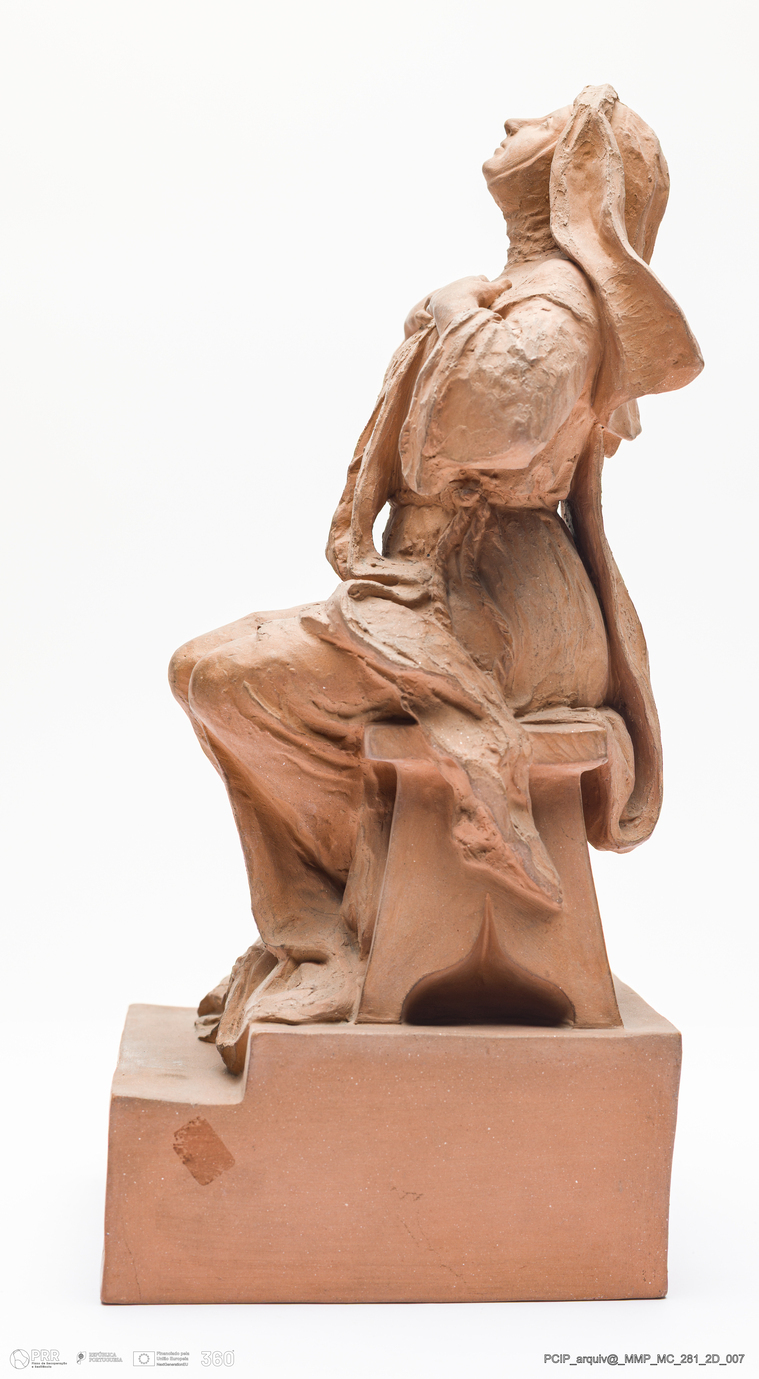 Matéria/Técnica: Barro vermelho modelado e moldado. Terracota; Cronologia: 1908; Autoria: Manuel Gustavo Bordalo Pinheiro / Fábrica Bordalo Pinheiro, Caldas da Rainha, Portugal; Dimensões (cm): Altura: 26,5; Largura: 12; Comprimento: 12.