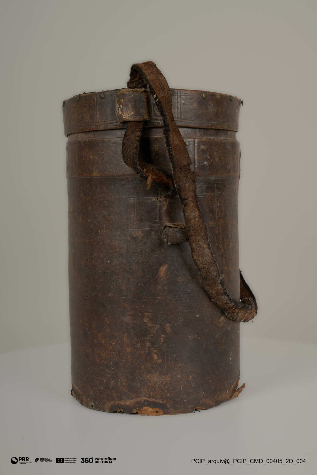 Matéria/Técnica: Pele; madeira; Cronologia: XVII; Autoria: Desconhecida; Dimensões: Altura: 27 cm; Diâmetro: 17 cm.