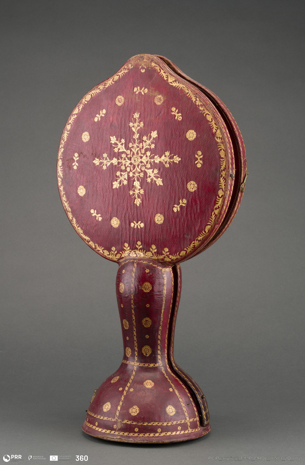 Matéria/Técnica: Couro, madeira e veludo; Cronologia: Desconhecida; Autoria: Desconhecida; Dimensões: Altura: 50,50 cm; Diâmetro: 17,10 cm; Peso: 1.175,00 gr.