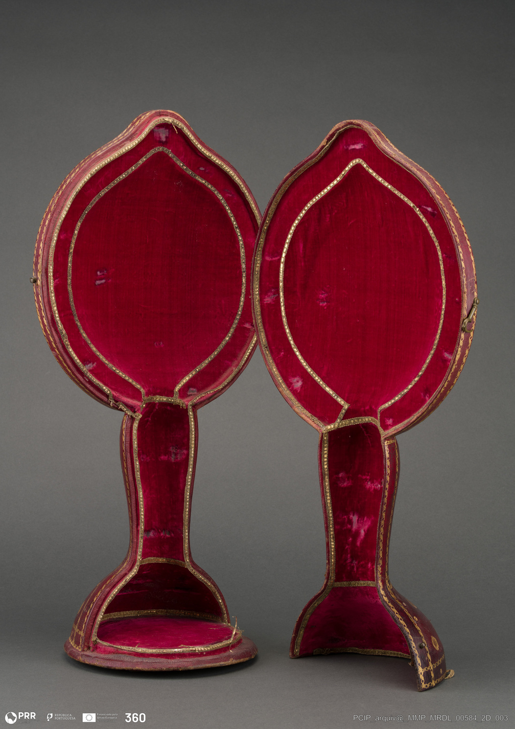 Matéria/Técnica: Couro, madeira e veludo; Cronologia: Desconhecida; Autoria: Desconhecida; Dimensões: Altura: 50,50 cm; Diâmetro: 17,10 cm; Peso: 1.175,00 gr.