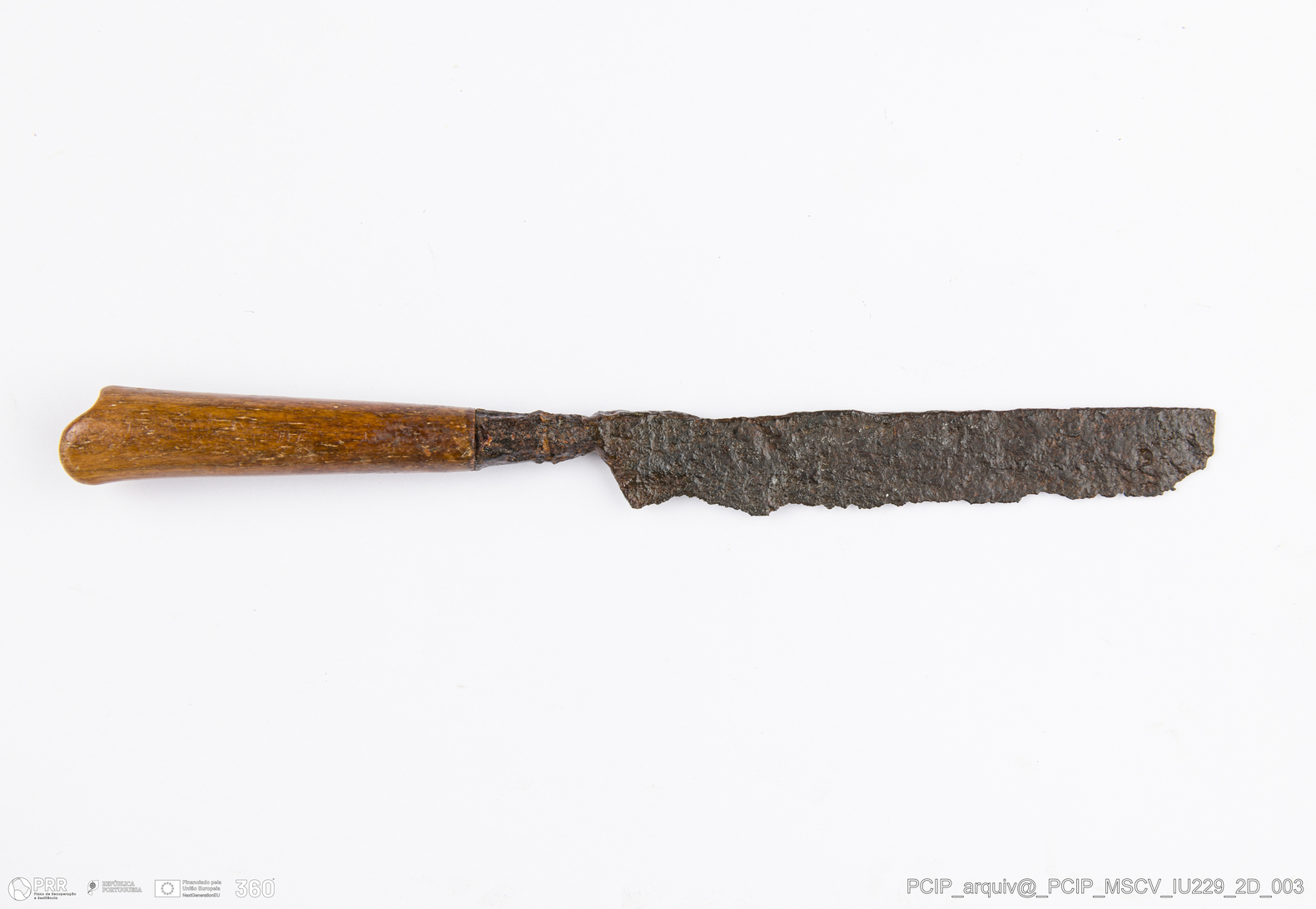 Matéria/Técnica: Metal e osso; Cronologia: Século XVII; Autoria: Desconhecida; Dimensões: Comprimento: 145mm; Largura: 12mm; Espessura: 9mm.
