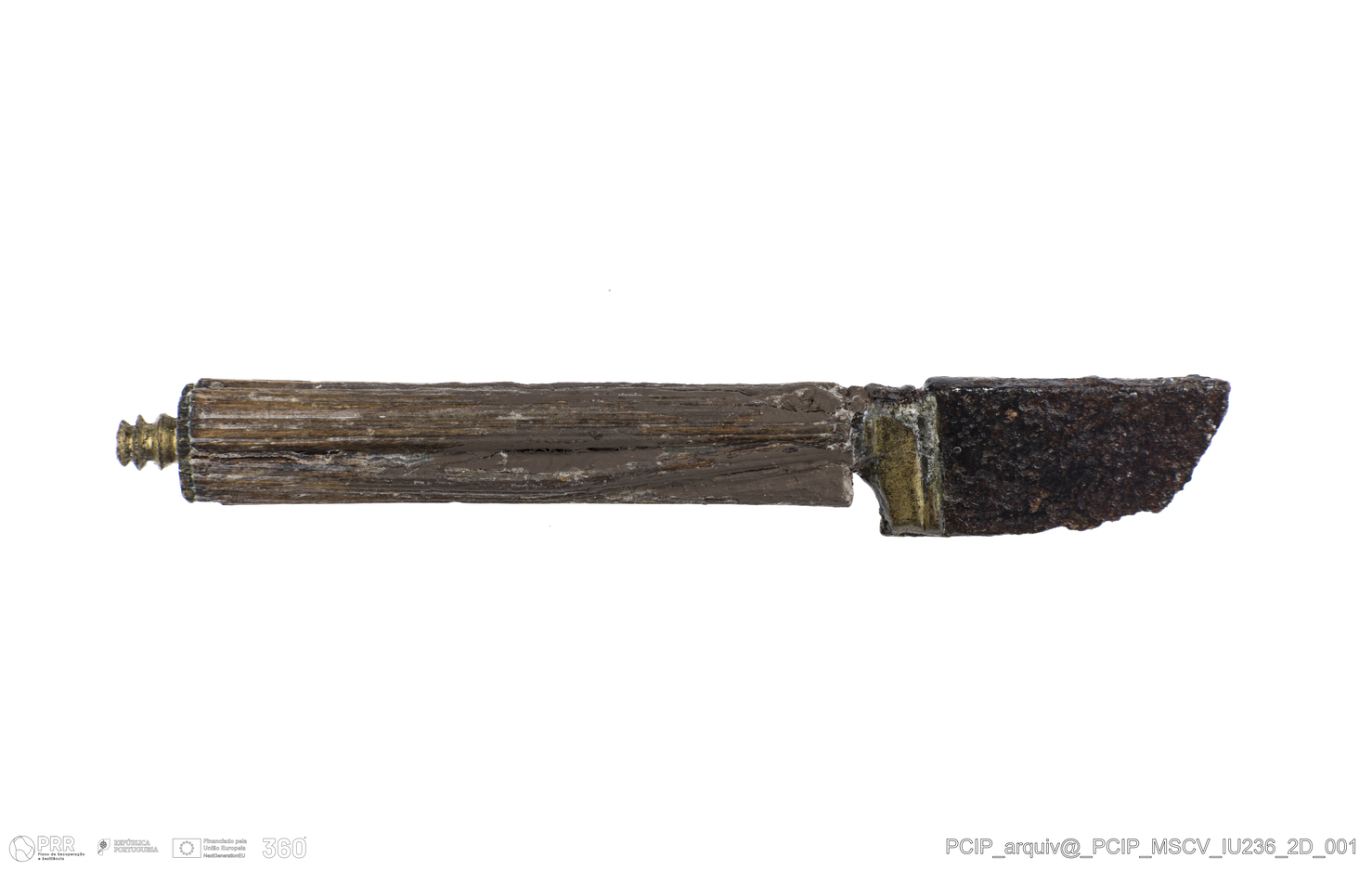 Matéria/Técnica: Osso e metal; Cronologia: Século XVII; Autoria: Desconhecida; Dimensões: Comprimento: 83,5mm; Largura: 13mm; Diâmetro cabo: 8,5mm.