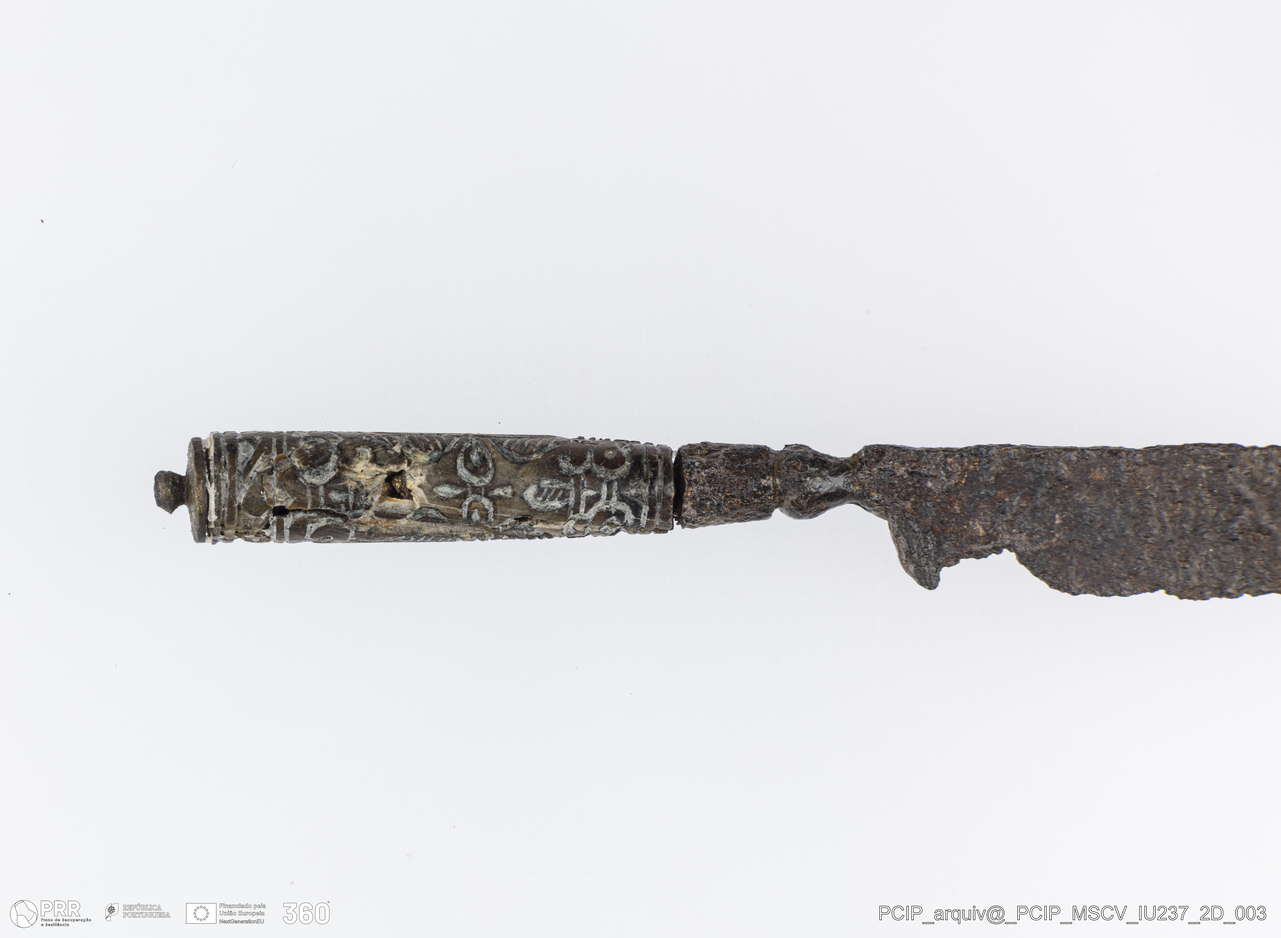Matéria/Técnica: Osso e ferro; Cronologia: Século XVII; Autoria: Desconhecida; Dimensões: Comprimento: 97,5mm; Largura: 11mm; Diâmetro cabo: 7,5mm.