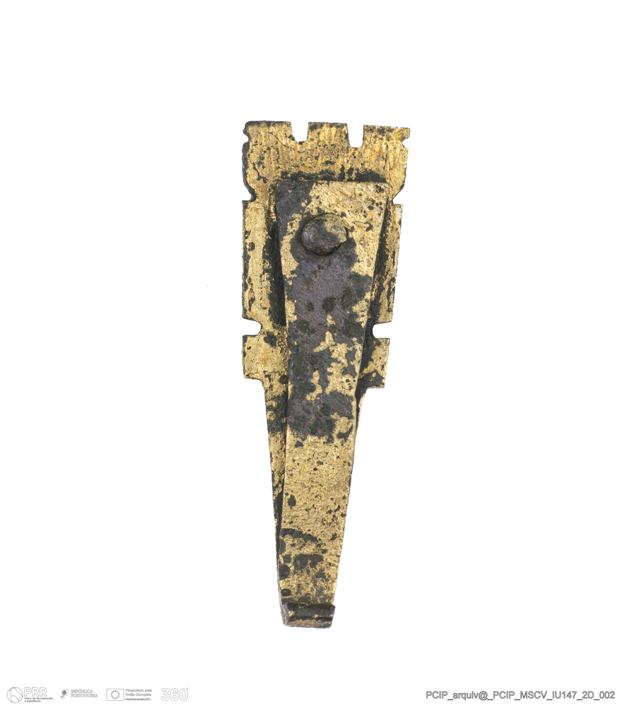 Matéria/Técnica: Metal; Cronologia: Século XVII; Autoria: Desconhecida; Dimensões: Comprimento: 50mm; Largura: 17mm; Espessura: 6mm.