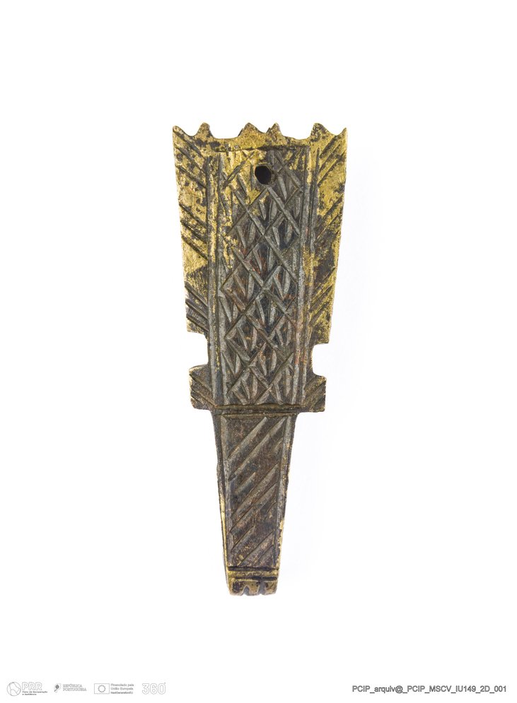 Matéria/Técnica: Metal; Cronologia: Século XVII; Autoria: Desconhecida; Dimensões: Comprimento: 38mm; Largura: 14mm; Espessura: 5mm.