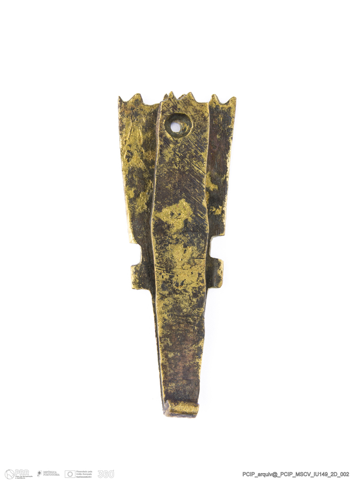 Matéria/Técnica: Metal; Cronologia: Século XVII; Autoria: Desconhecida; Dimensões: Comprimento: 38mm; Largura: 14mm; Espessura: 5mm.