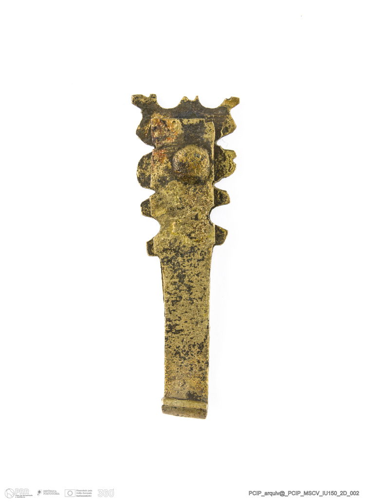 Matéria/Técnica: Liga de cobre; Cronologia: Século XVII; Autoria: Desconhecida; Dimensões: Altura: 33mm; Largura: 11mm; Espessura: 4,5mm.