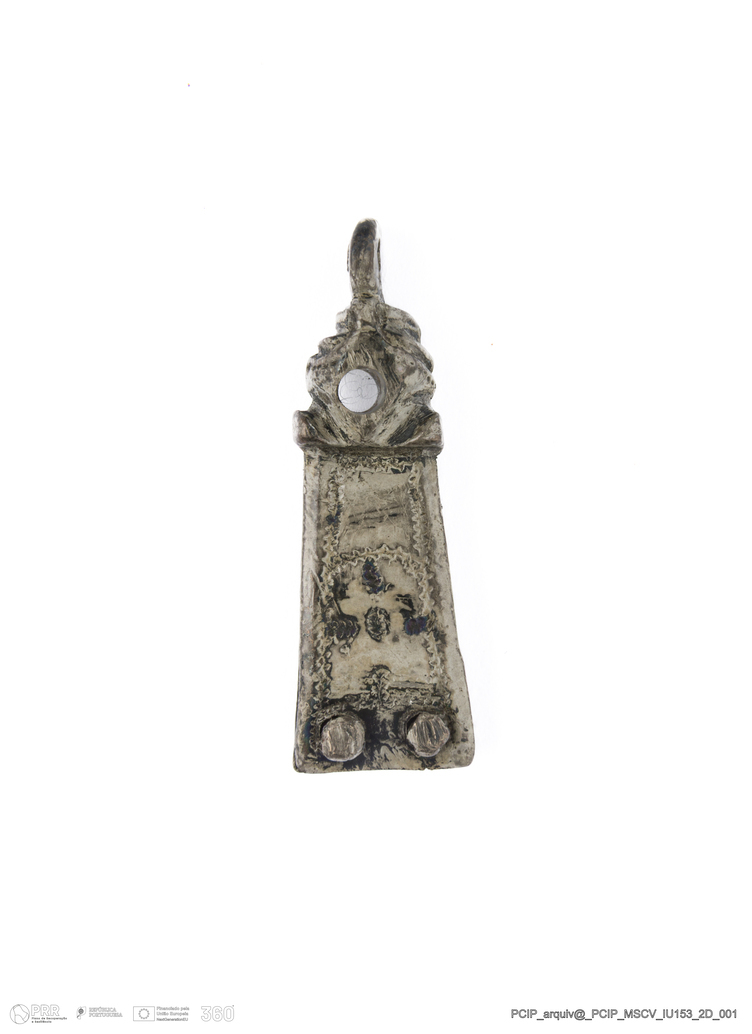 Matéria/Técnica: Liga de cobre; Cronologia: Século XVII; Autoria: Desconhecida; Dimensões: Altura: 23mm; Largura: 9mm; Espessura: 4,5mm.