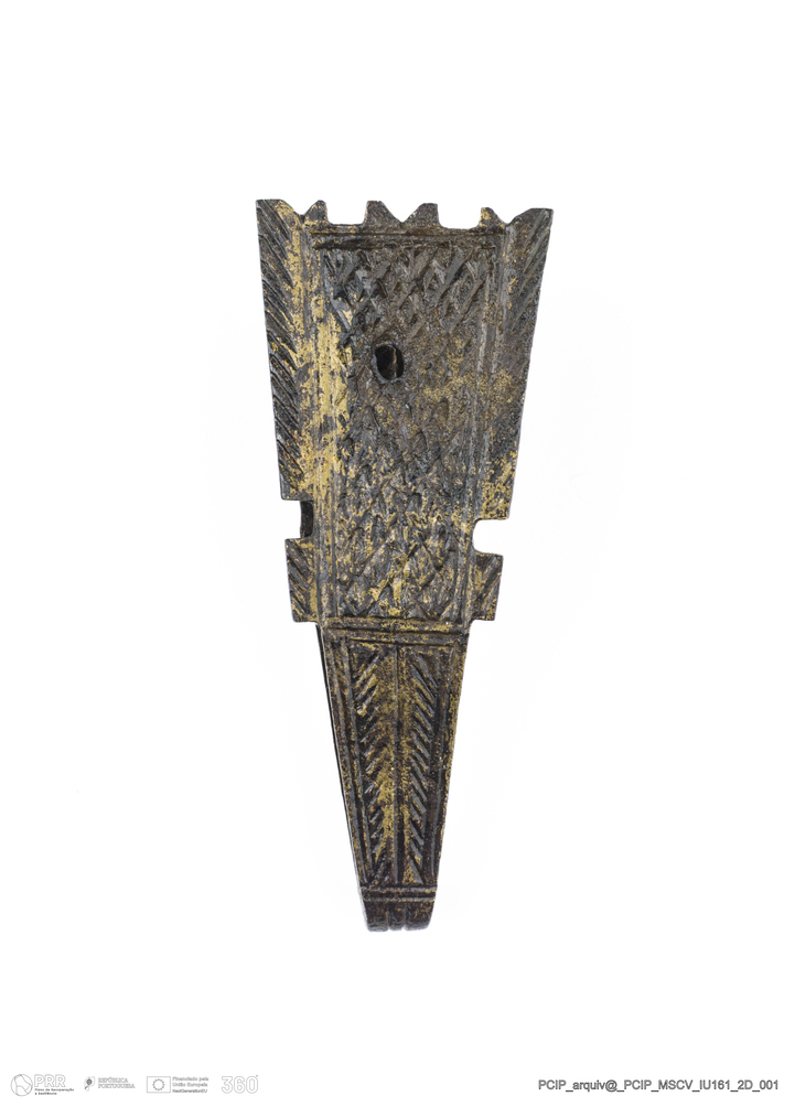 Matéria/Técnica: Metal; Cronologia: Século XVII; Autoria: Desconhecida; Dimensões: Comprimento: 49mm; Largura: 19mm; Espessura: 5mm.