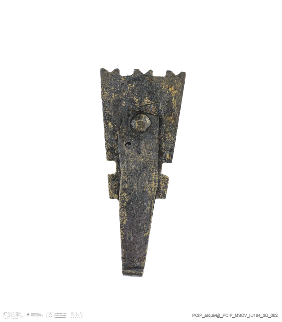 Matéria/Técnica: Liga de cobre; Cronologia: Século XVII; Autoria: Desconhecida; Dimensões: Altura: 45,5mm; Largura: 19mm; Espessura: 3,5mm.