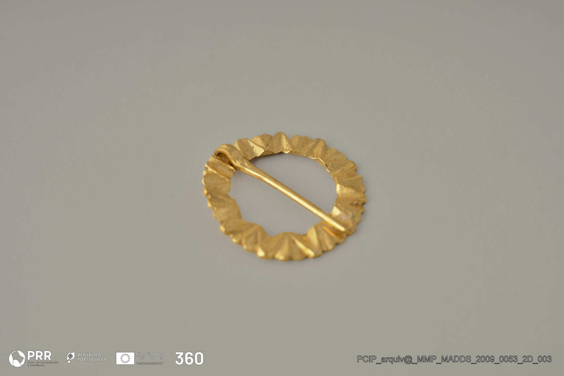 Matéria/Técnica: Ouro; Cronologia: Romano; Autoria: Desconhecida; Dimensões (cm): 1,7 x 1,7 x 0,1.