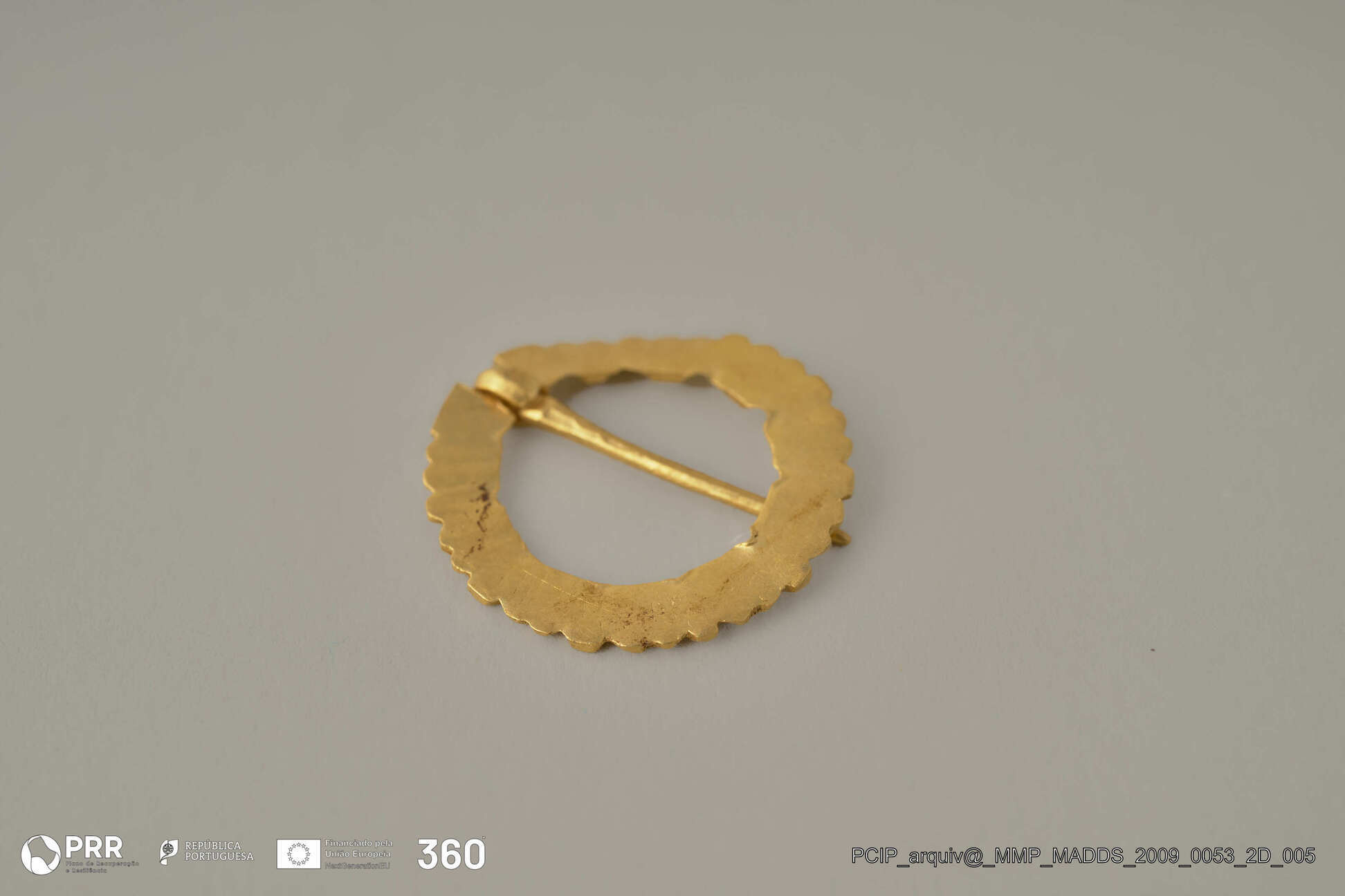 Matéria/Técnica: Ouro; Cronologia: Romano; Autoria: Desconhecida; Dimensões (cm): 1,7 x 1,7 x 0,1.