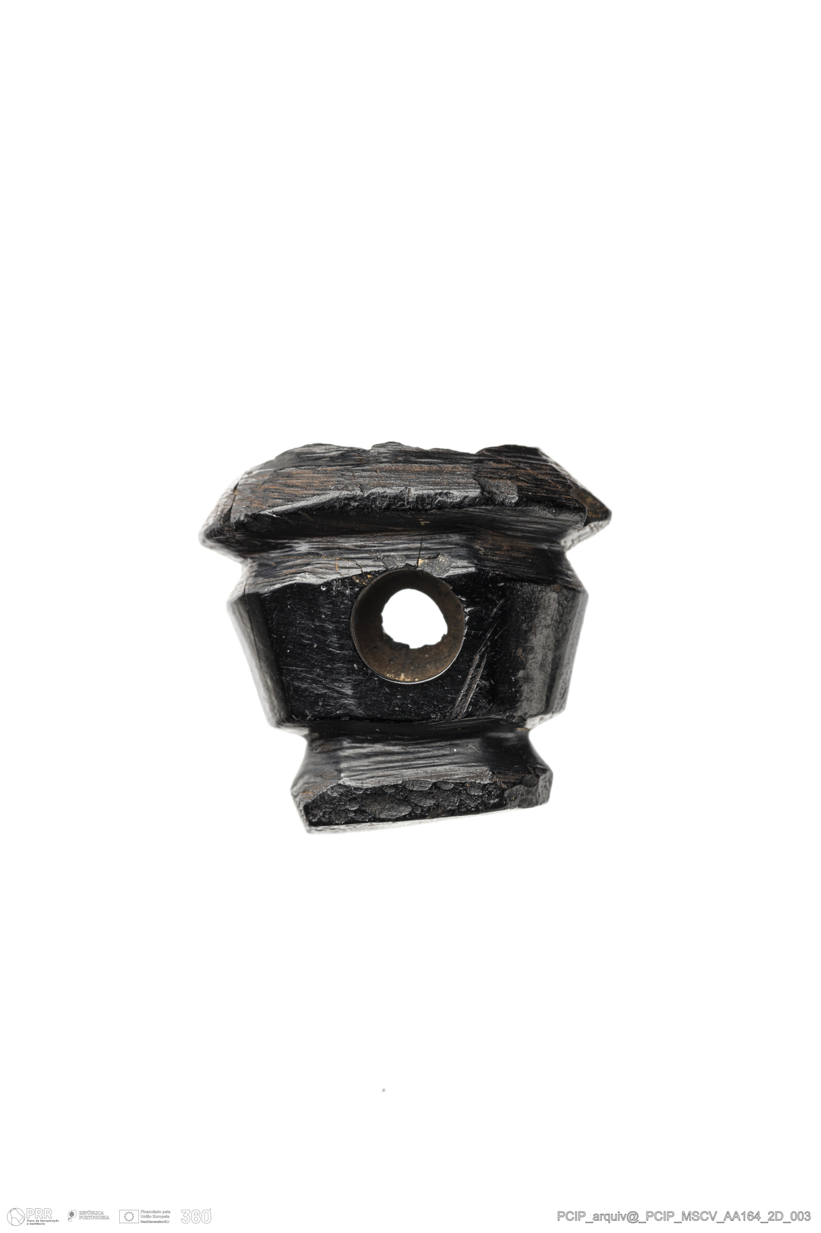 Matéria/Técnica: Azeviche; Cronologia: Século XVI- XVII; Autoria: Desconhecida; Dimensões: Comprimento: 16mm; Largura: 18mm; Espessura: 11mm.