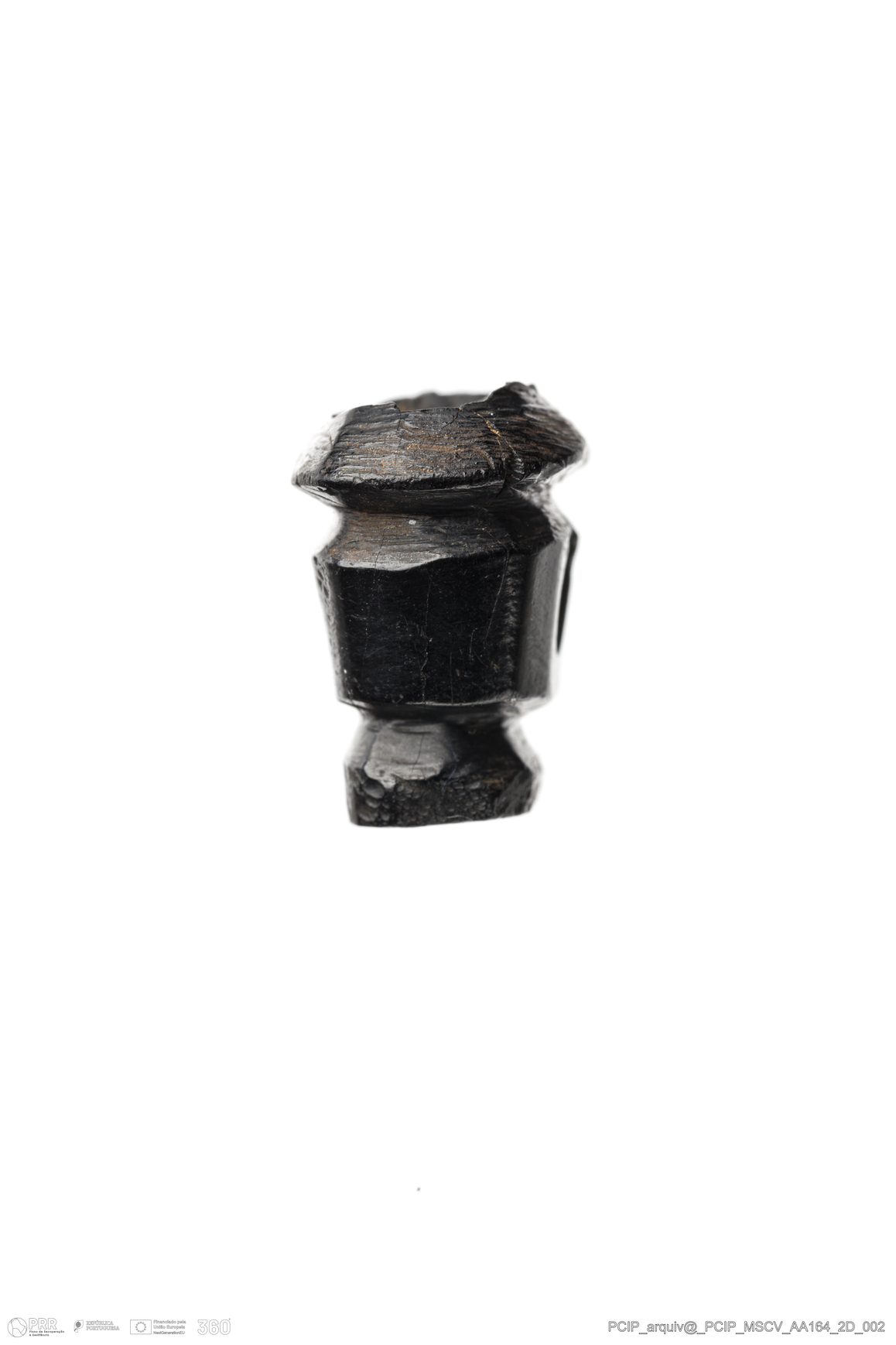 Matéria/Técnica: Azeviche; Cronologia: Século XVI- XVII; Autoria: Desconhecida; Dimensões: Comprimento: 16mm; Largura: 18mm; Espessura: 11mm.