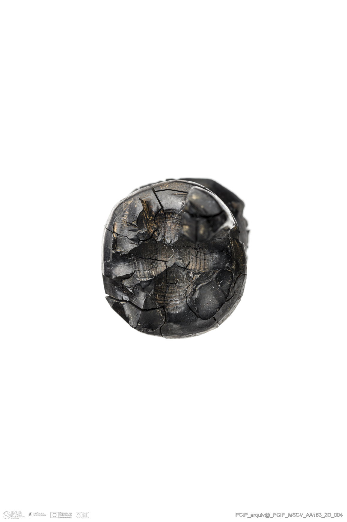 Matéria/Técnica: Azeviche; Cronologia: Século XVI- XVII; Autoria: Desconhecida; Dimensões: Comprimento: 23,5mm; Largura: 17mm; Espessura: 16mm.