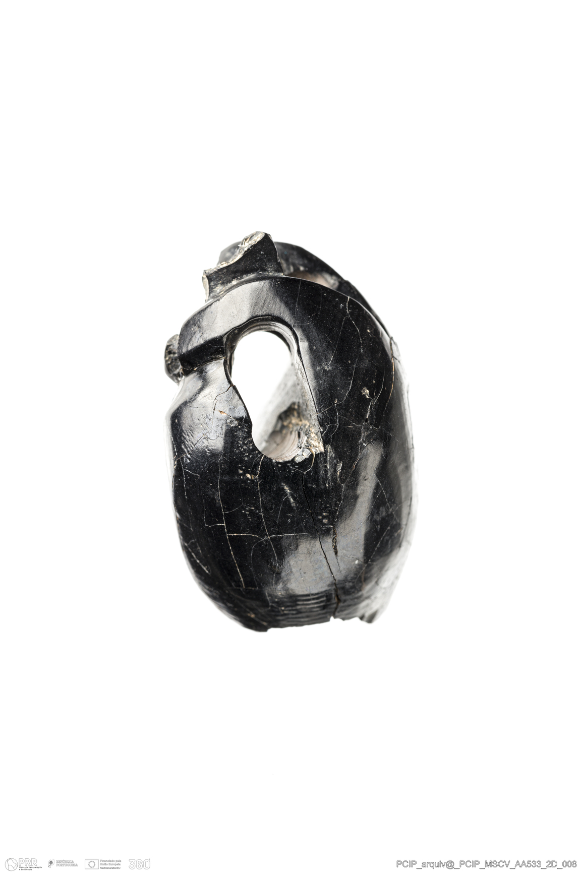 Matéria/Técnica: Azeviche; Cronologia: Século XVI-XVII; Autoria: Desconhecida; Dimensões: Largura: 35mm Altura / Espessura: 24mm Comprimento / Profundidade: 42mm.