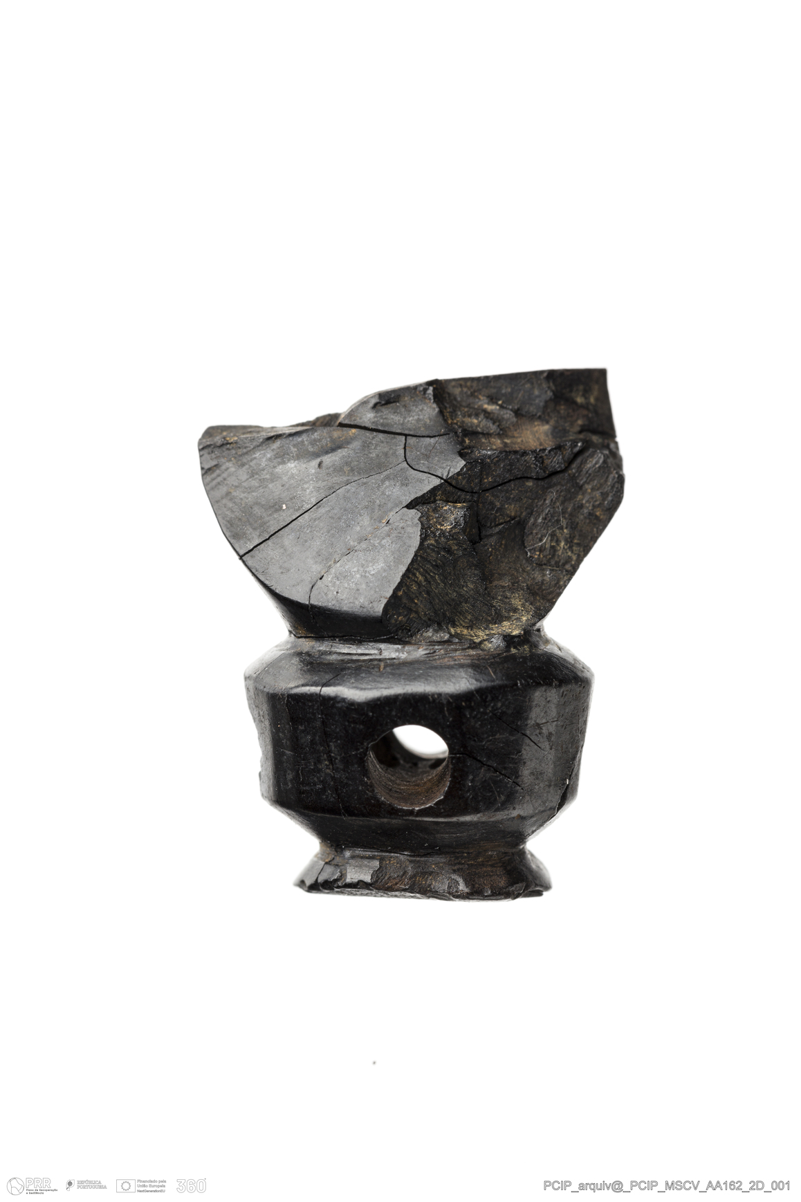 Matéria/Técnica: Azeviche; Cronologia: Século XVI- XVII; Autoria: Desconhecida; Dimensões: Comprimento: 23mm; Largura: 19mm; Espessura: 13mm.