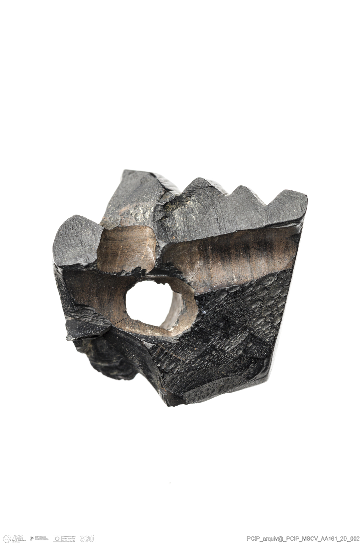 Matéria/Técnica: Azeviche; Cronologia: Século XVI- XVII; Autoria: Desconhecida; Dimensões: Comprimento: 24mm; Largura: 24mm; Espessura: 15mm.