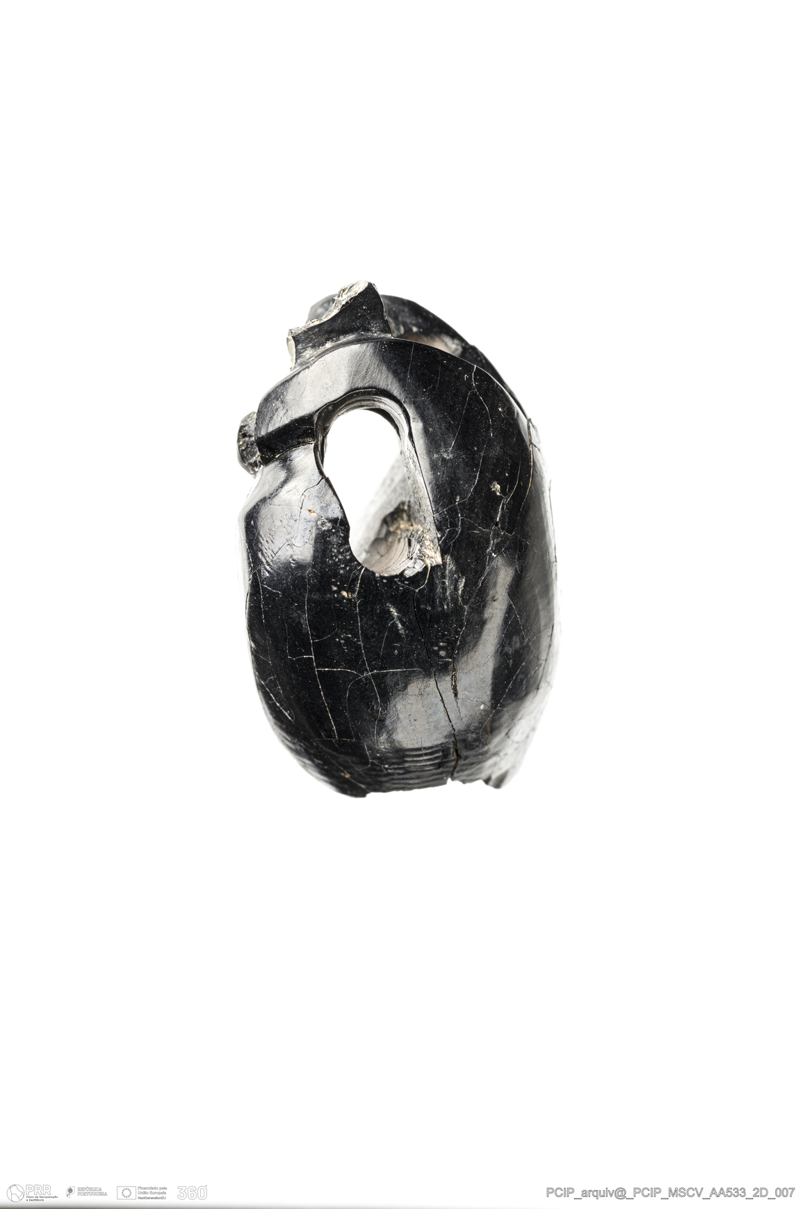 Matéria/Técnica: Azeviche; Cronologia: Século XVI-XVII; Autoria: Desconhecida; Dimensões: Largura: 35mm Altura / Espessura: 24mm Comprimento / Profundidade: 42mm.