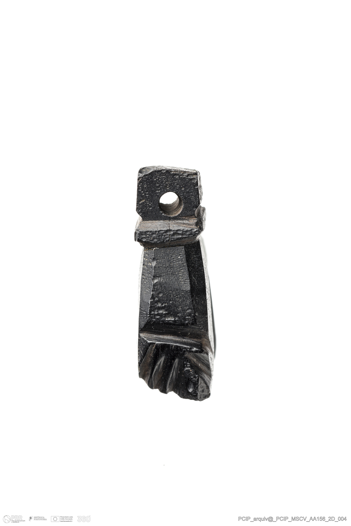 Matéria/Técnica: Azeviche; Cronologia: Século XVI- XVII; Autoria: Desconhecida; Dimensões: Comprimento: 21mm; Largura: 12mm; Espessura: 7mm.