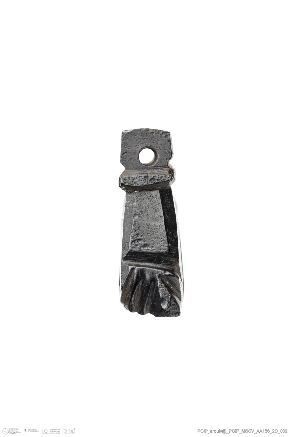 Matéria/Técnica: Azeviche; Cronologia: Século XVI- XVII; Autoria: Desconhecida; Dimensões: Comprimento: 21mm; Largura: 12mm; Espessura: 7mm.