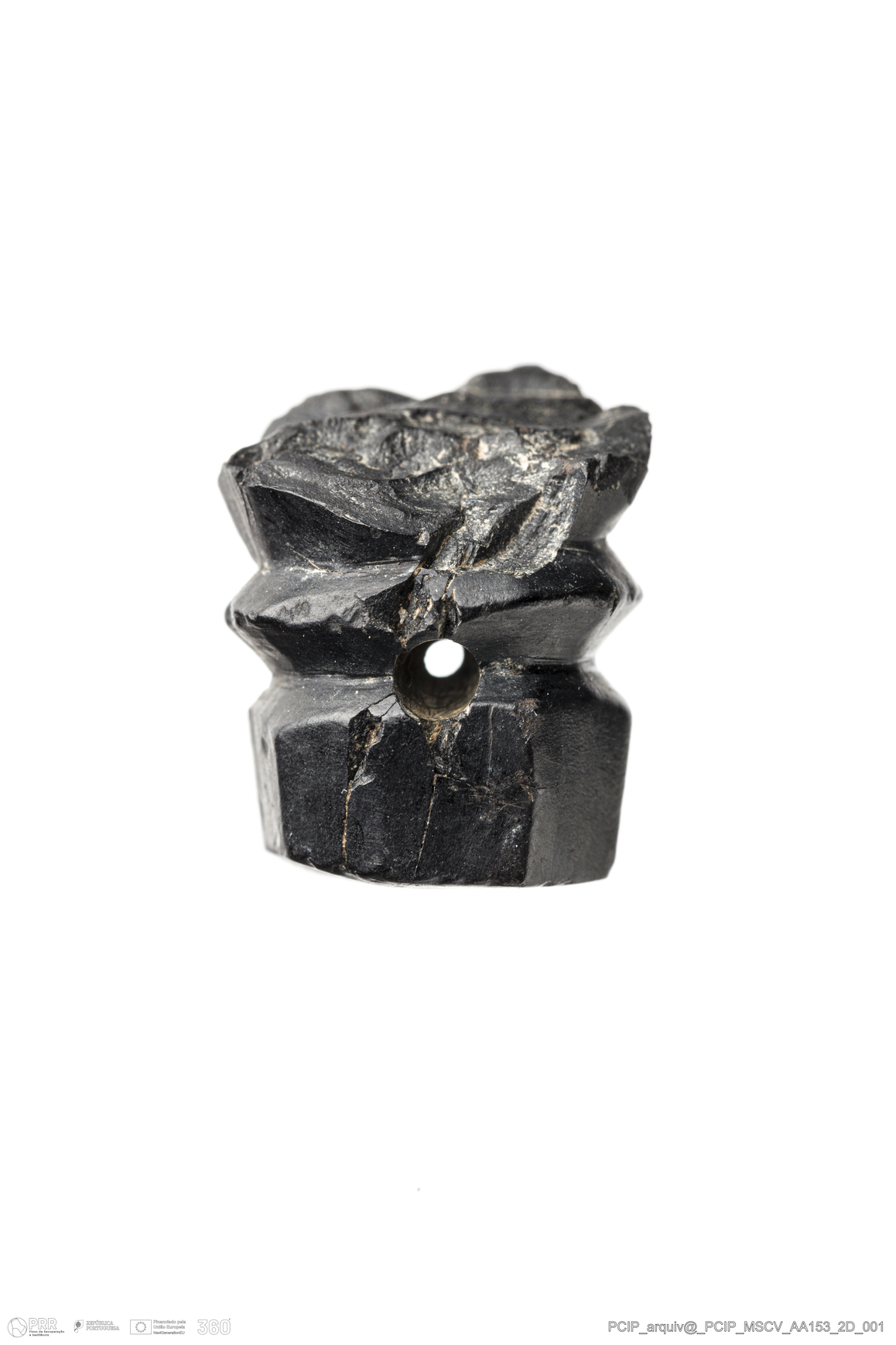 Matéria/Técnica: Azeviche; Cronologia: Século XVI- XVII; Autoria: Desconhecida; Dimensões: Comprimento: 20mm; Largura: 16mm; Espessura: 14mm.