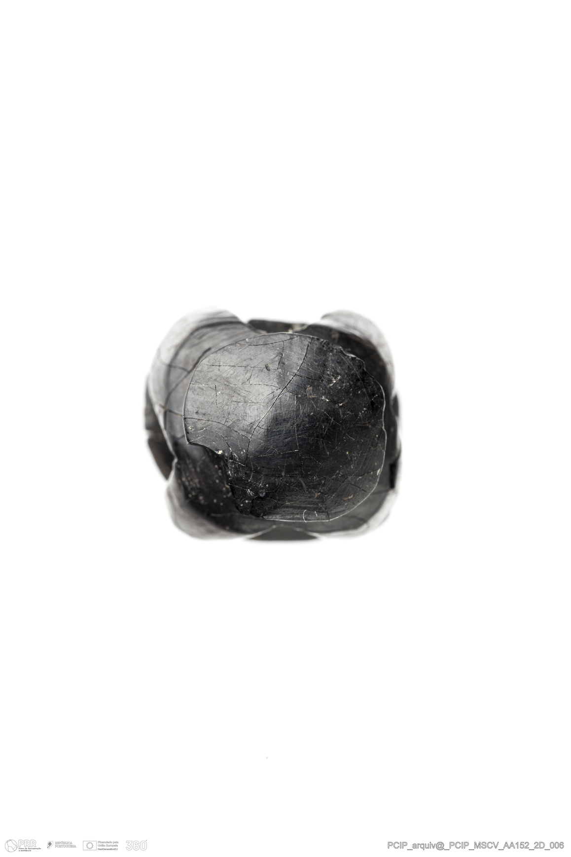 Matéria/Técnica: Azeviche; Cronologia: Século XVI- XVII; Autoria: Desconhecida; Dimensões: Comprimento: 24mm; Largura: 17mm; Espessura: 15mm.