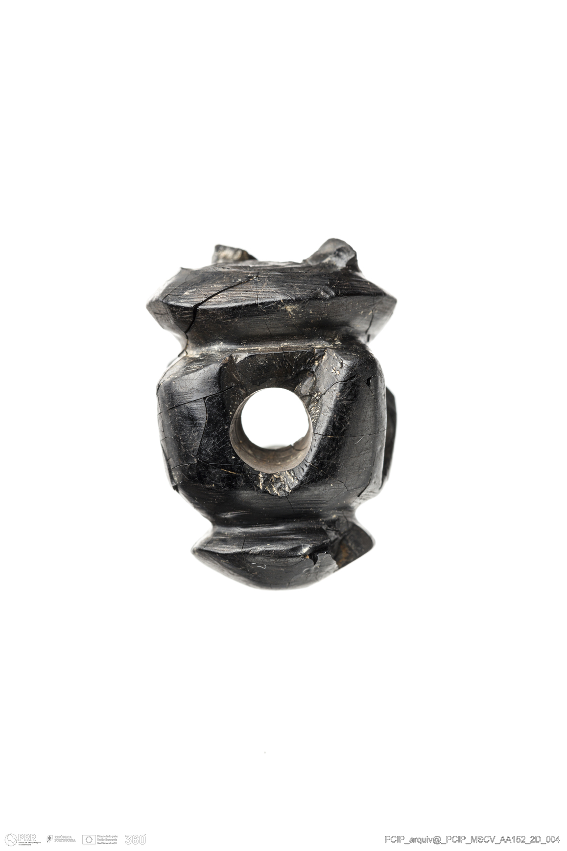 Matéria/Técnica: Azeviche; Cronologia: Século XVI- XVII; Autoria: Desconhecida; Dimensões: Comprimento: 24mm; Largura: 17mm; Espessura: 15mm.