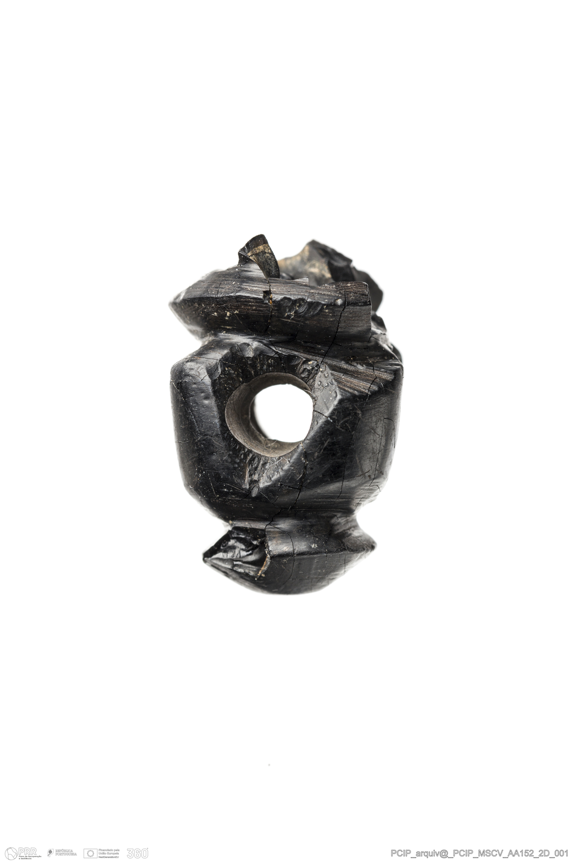 Matéria/Técnica: Azeviche; Cronologia: Século XVI- XVII; Autoria: Desconhecida; Dimensões: Comprimento: 24mm; Largura: 17mm; Espessura: 15mm.