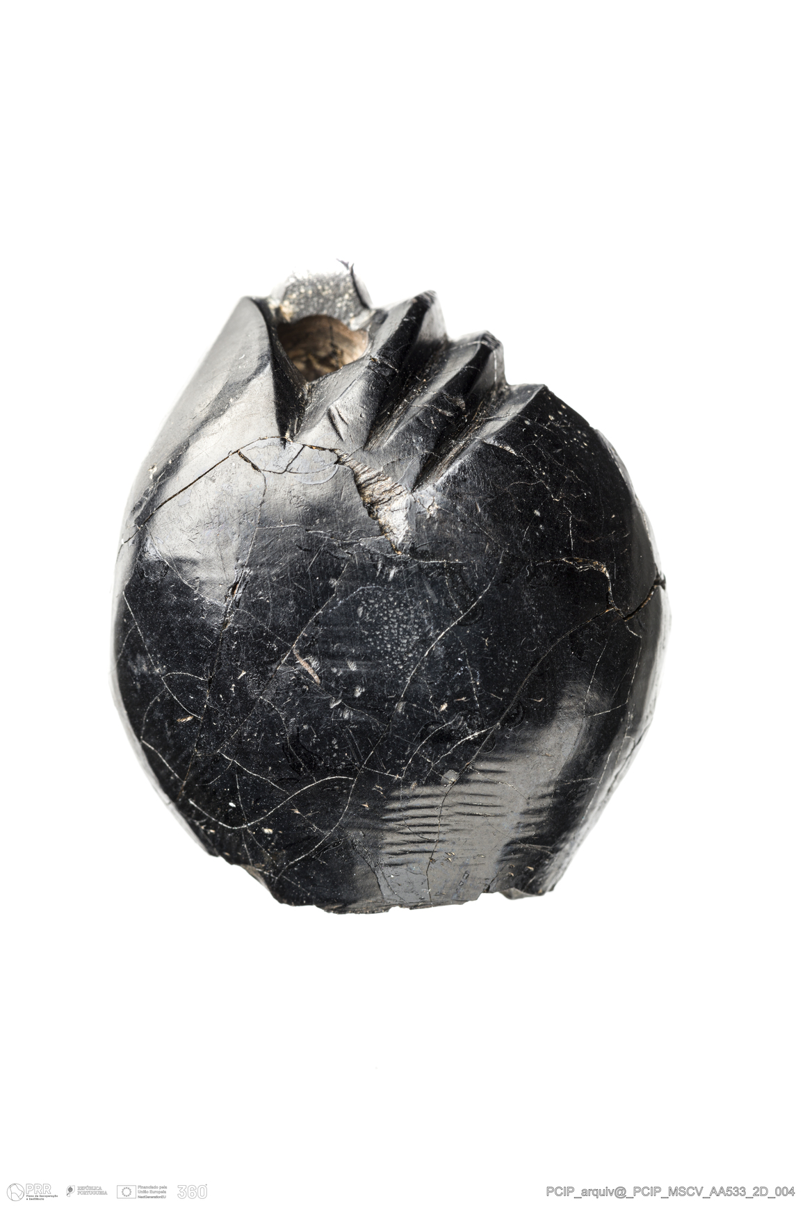 Matéria/Técnica: Azeviche; Cronologia: Século XVI-XVII; Autoria: Desconhecida; Dimensões: Largura: 35mm Altura / Espessura: 24mm Comprimento / Profundidade: 42mm.