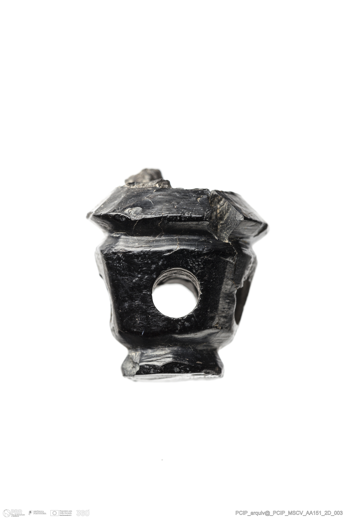 Matéria/Técnica: Azeviche; Cronologia: Século XVI- XVII; Autoria: Desconhecida; Dimensões: Comprimento: 21mm; Largura: 17mm; Espessura: 15mm.