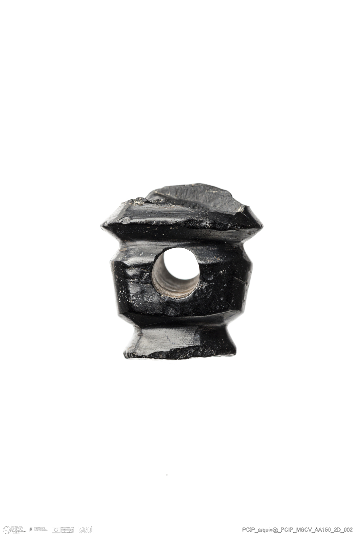 Matéria/Técnica: Azeviche; Cronologia: Século XVI- XVII; Autoria: Desconhecida; Dimensões: Comprimento: 17mm; Largura: 16mm; Espessura: 10mm.