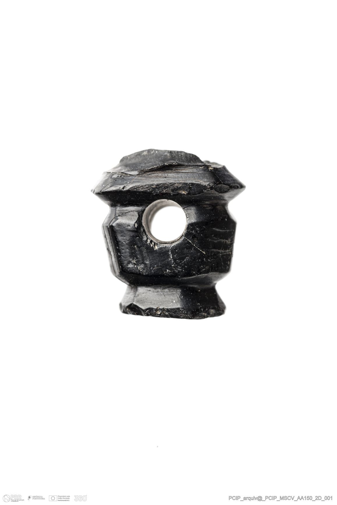 Matéria/Técnica: Azeviche; Cronologia: Século XVI- XVII; Autoria: Desconhecida; Dimensões: Comprimento: 17mm; Largura: 16mm; Espessura: 10mm.