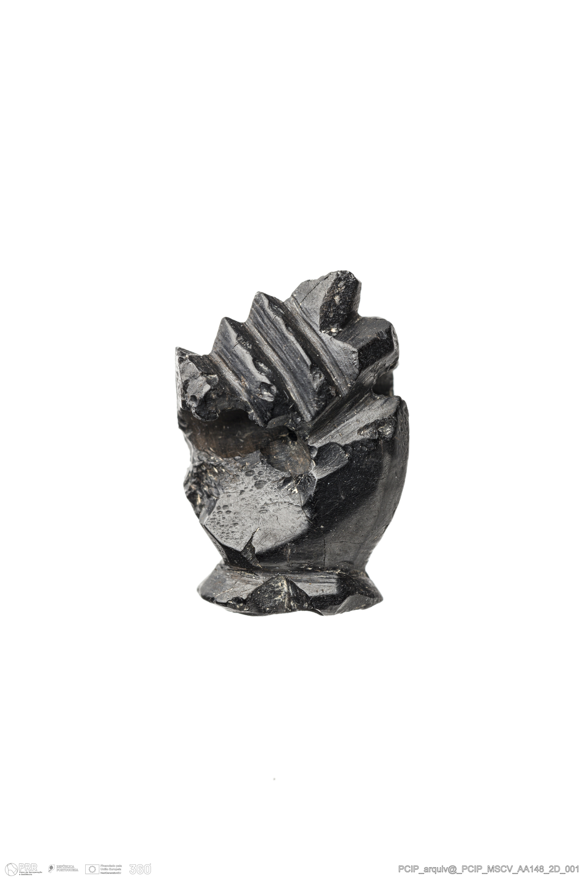 Matéria/Técnica: Azeviche; Cronologia: Século XVI- XVII; Autoria: Desconhecida; Dimensões: Comprimento: 19mm; Largura: 12mm; Espessura: 7mm.