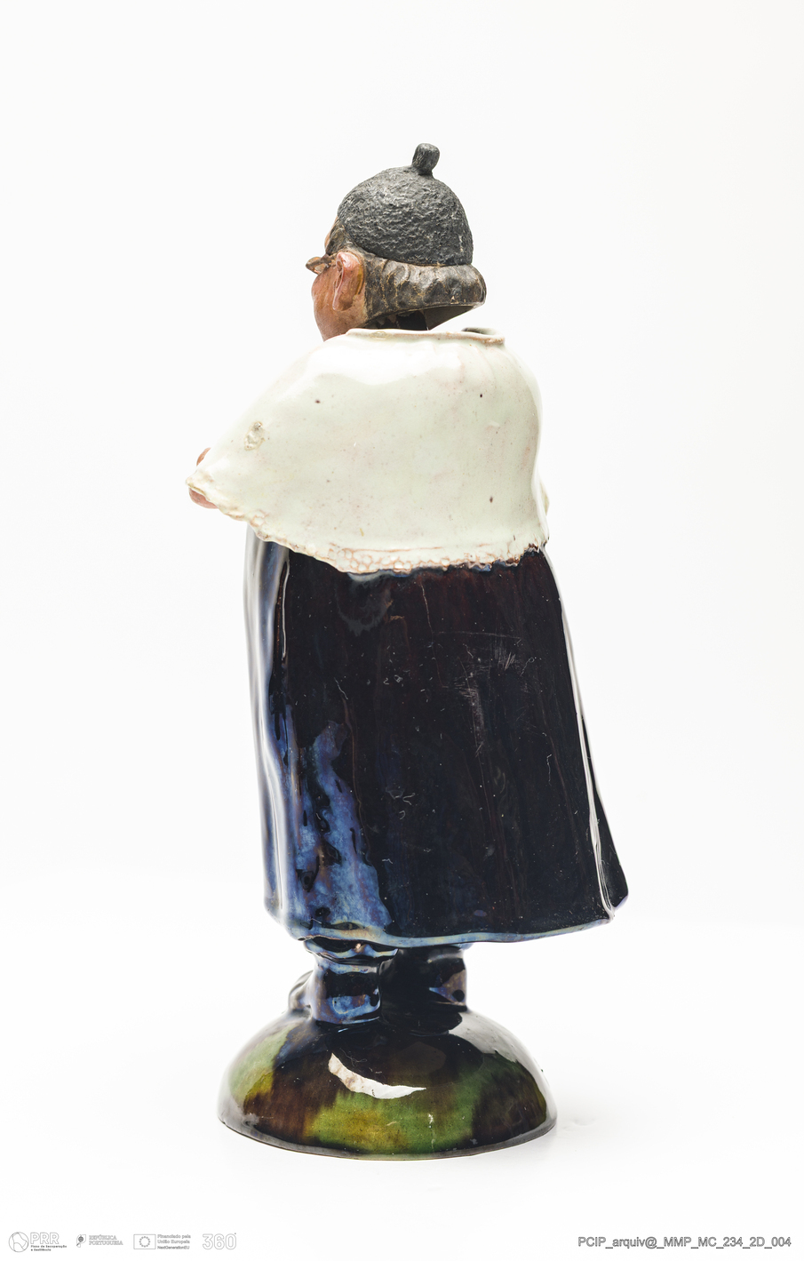 Matéria/Técnica: Barro vermelho moldado e modelado. Vidrado polícromo: branco, preto e vermelho. Terracota com pintura a frio nas mãos e rosto; Cronologia: 1903-1905; Autoria: Rafael Bordalo Pinheiro / Fábrica de Faianças das Caldas da Rainha, Portugal; Dimensões (cm): Altura: 24,4; Largura: 11,8; Comprimento: 9,8.