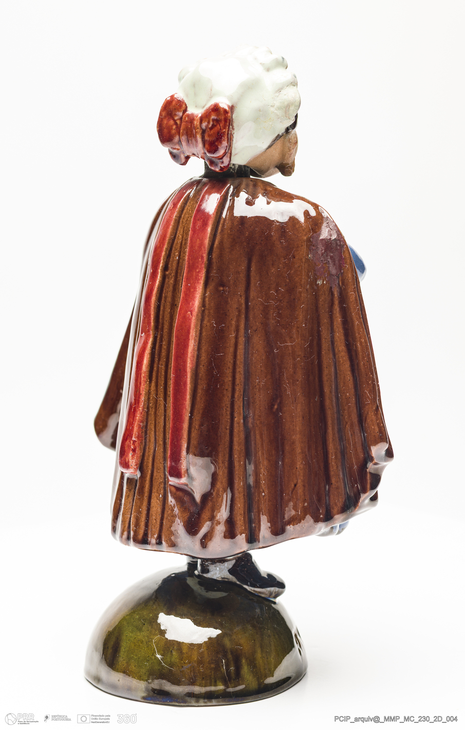 Matéria/Técnica: Barro vermelho modelado e moldado. Vidrado polícromo: castanho, branco, verde. Mãos e rosto com pintura a rio; Cronologia: 1897; Autoria: Rafael Bordalo Pinheiro / Fábrica de Faianças das Caldas da Rainha, Portugal; Dimensões (cm): Altura: 24,2; Largura: 14,9; Comprimento: 11,1.