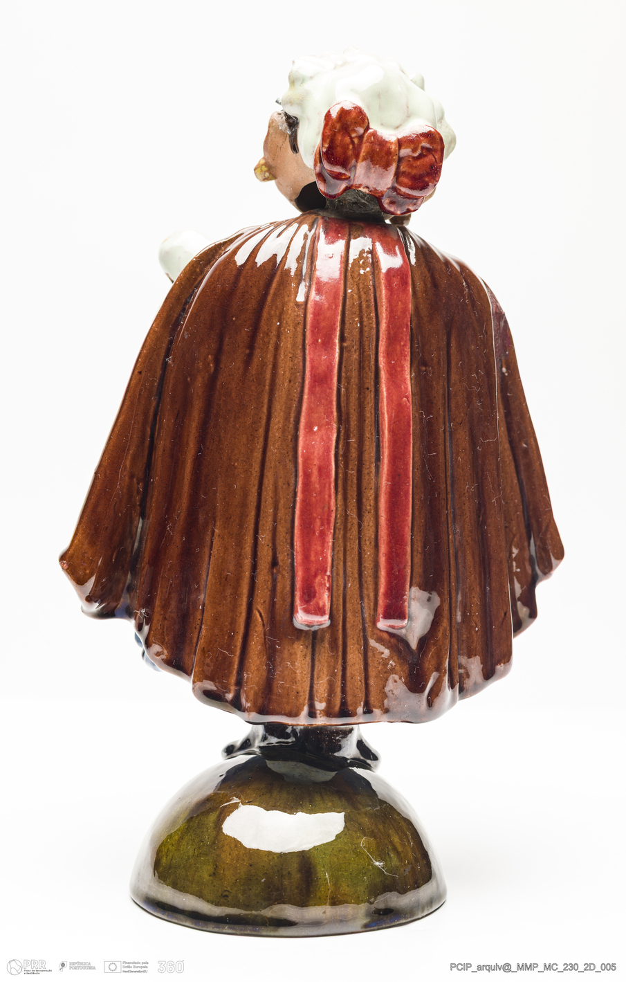 Matéria/Técnica: Barro vermelho modelado e moldado. Vidrado polícromo: castanho, branco, verde. Mãos e rosto com pintura a rio; Cronologia: 1897; Autoria: Rafael Bordalo Pinheiro / Fábrica de Faianças das Caldas da Rainha, Portugal; Dimensões (cm): Altura: 24,2; Largura: 14,9; Comprimento: 11,1.