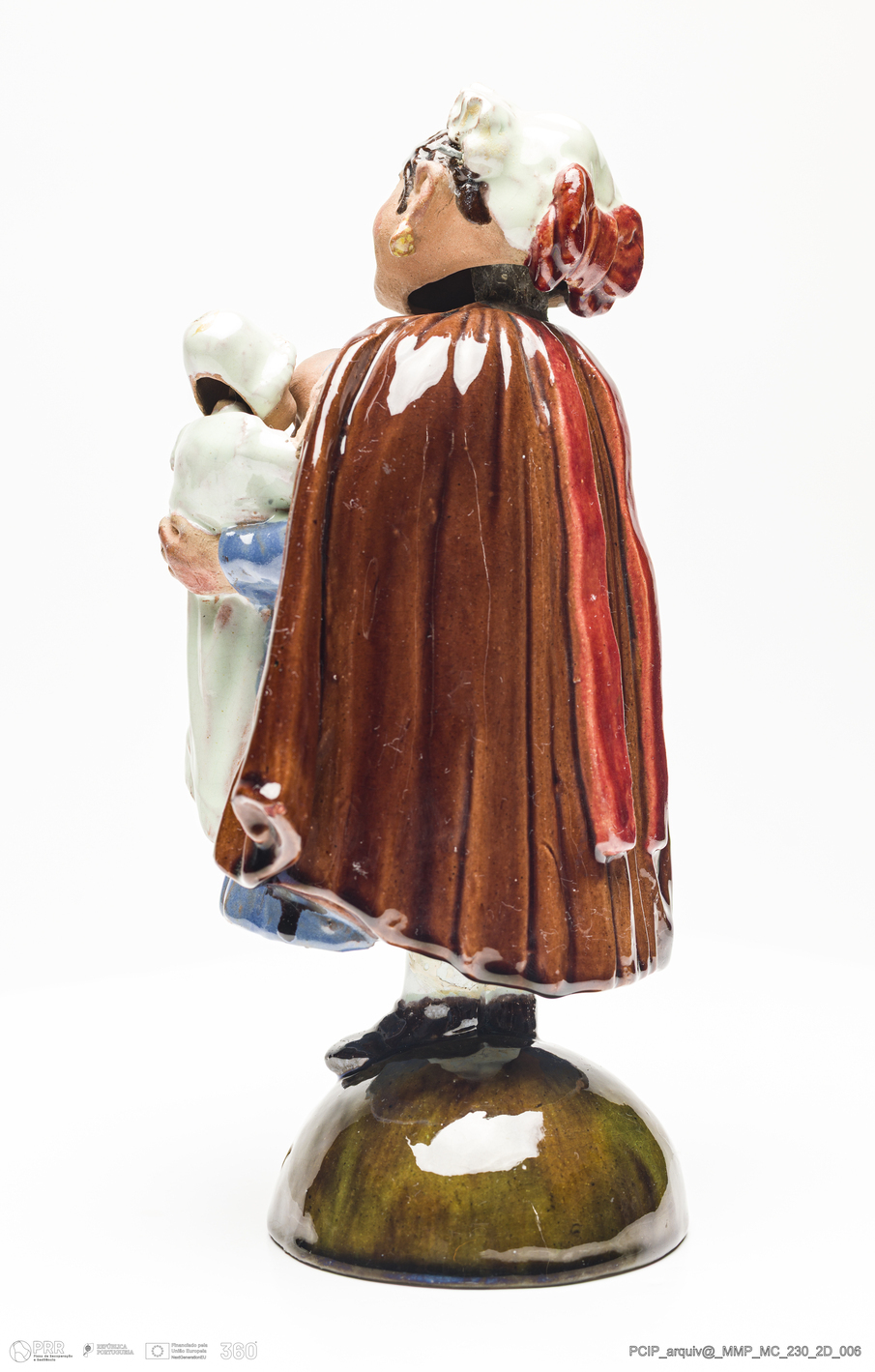 Matéria/Técnica: Barro vermelho modelado e moldado. Vidrado polícromo: castanho, branco, verde. Mãos e rosto com pintura a rio; Cronologia: 1897; Autoria: Rafael Bordalo Pinheiro / Fábrica de Faianças das Caldas da Rainha, Portugal; Dimensões (cm): Altura: 24,2; Largura: 14,9; Comprimento: 11,1.
