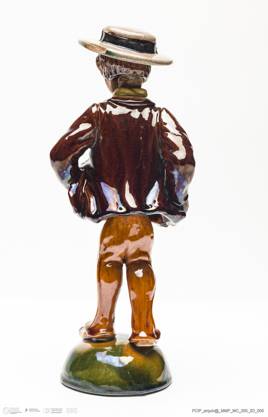 Matéria/Técnica: Barro vermelho moldado. Vidrado polícromo: vermelho, amarelo, ocre, branco. Rosto e mãos com pintura a frio; Cronologia: século XX; Autoria: José Alves Cunha Sucessor/ Fábrica de e José Alves Cunha Sucessor, Caldas da Rainha, Portugal; Dimensões (cm): Altura: 24,2; Largura: 11,8; Comprimento: 8,6.