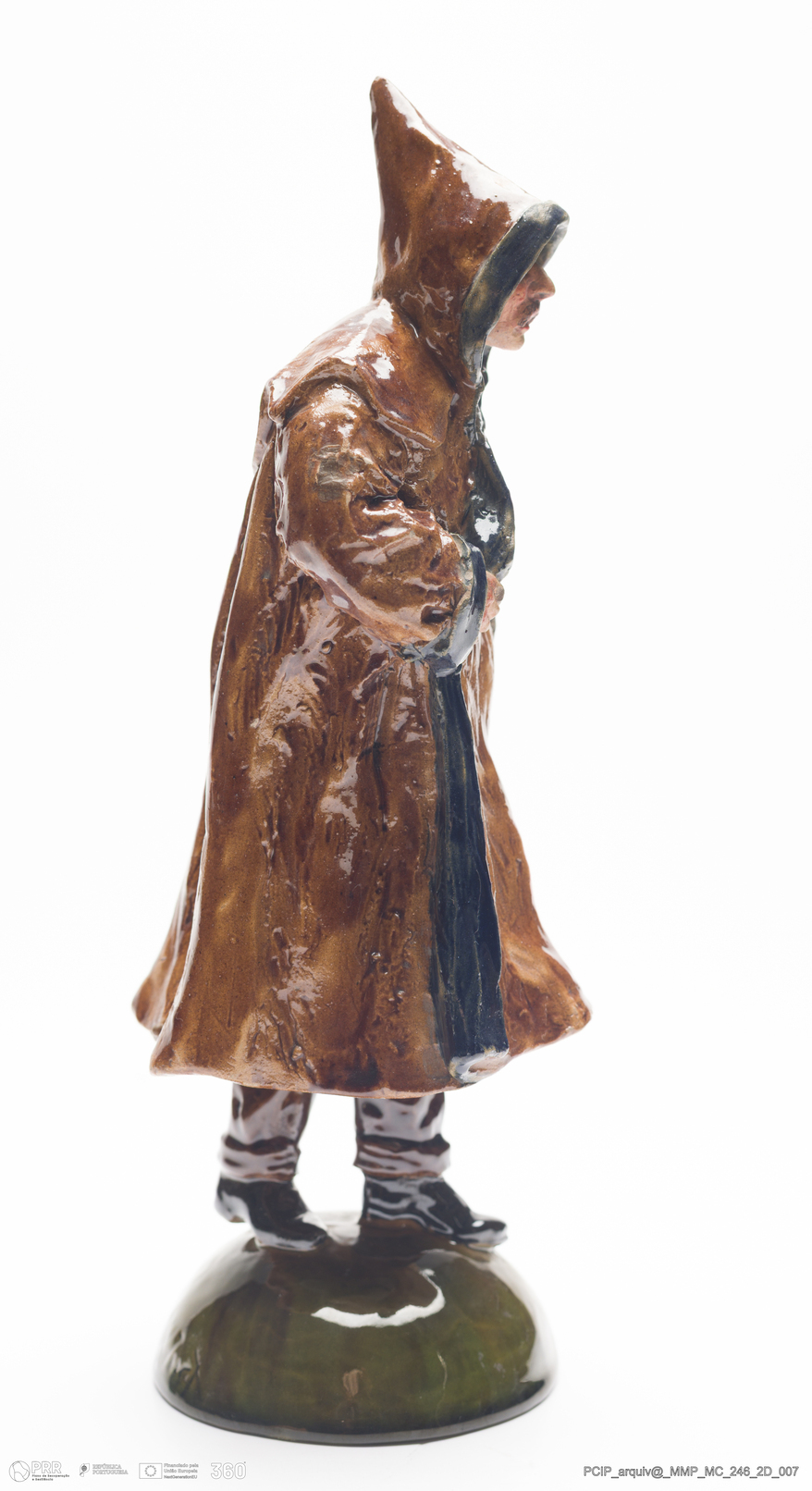 Matéria/Técnica: Barro vermelho modelado e moldado. Vidrado polícromo: verde, preto, castanho e ocre. Rosto e mãos pintados a frio; Cronologia: 1908; Autoria: Manuel Gustavo Bordalo Pinheiro / Fábrica Bordalo Pinheiro, Caldas da Rainha, Portugal; Dimensões (cm): Altura: 26,1; Largura: 10.