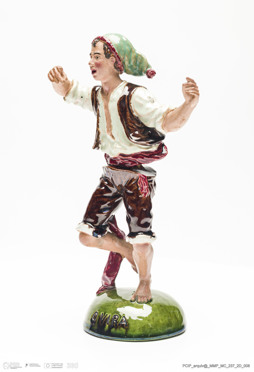 Matéria/Técnica: Barro vermelho modelado e moldado. Vidrado polícromo: verde, castanho, branco e vermelho. Rosto e braços pintados a frio; Cronologia: 1913; Autoria: José Alves Cunha/ Fábrica de José Alves Cunha, Caldas da Rainha, Portugal; Dimensões (cm): Altura: 21,2; Largura: 12,7.