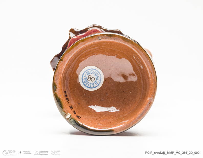 Matéria/Técnica: Barro vermelho moldado. Vidrado polícromo: verde, castanho, vermelho, cinzento e branco. Rosto, braços e pernas em terracota pintado a frio; Cronologia: 1908-1924; Autoria: Rafael Bordalo Pinheiro / Fábrica de Faianças das Caldas da Rainha, Portugal; Dimensões (cm): Altura: 22,2; Largura: 9,2.