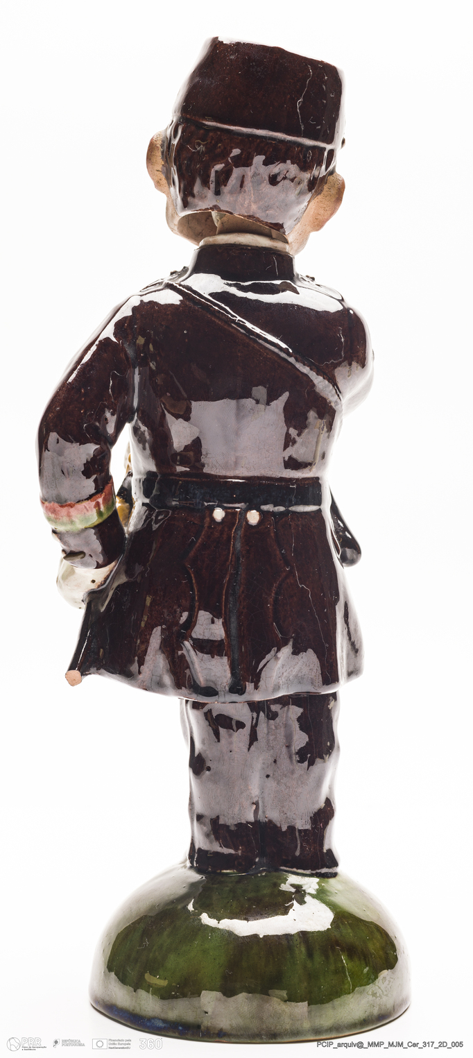 Matéria/Técnica: Barro vidrado; Cronologia: 1908; Autoria: Manuel Gustavo Bordalo Pinheiro; Dimensões: Comprimento: 9,1 x Altura: 23,8 x Largura: 8,4 cm.